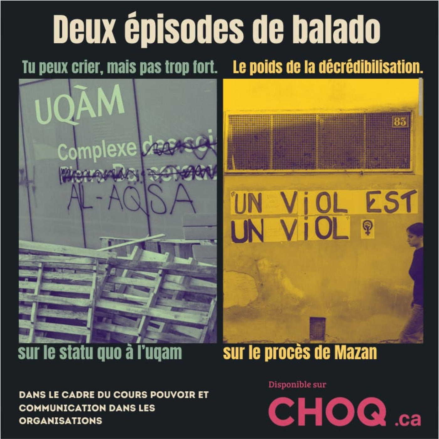 Le poids de la décrédibilisation. - COM7632 : Communication & Pouvoir dans les organisations À partir des procès de l'Affaire Mazan et du Violeur de Tinder, ce podcast aborde la question des agressions sexuelles sous l’angle des enjeux de décrédibilisation rencontrés par les victimes, tant dans la sphère médiatique que judiciaire. Nous accueillons également Megan, de Juripop, pour discuter des avancées d'un nouveau projet de loi qui tentera d'améliorer la situation pour les survivantes.