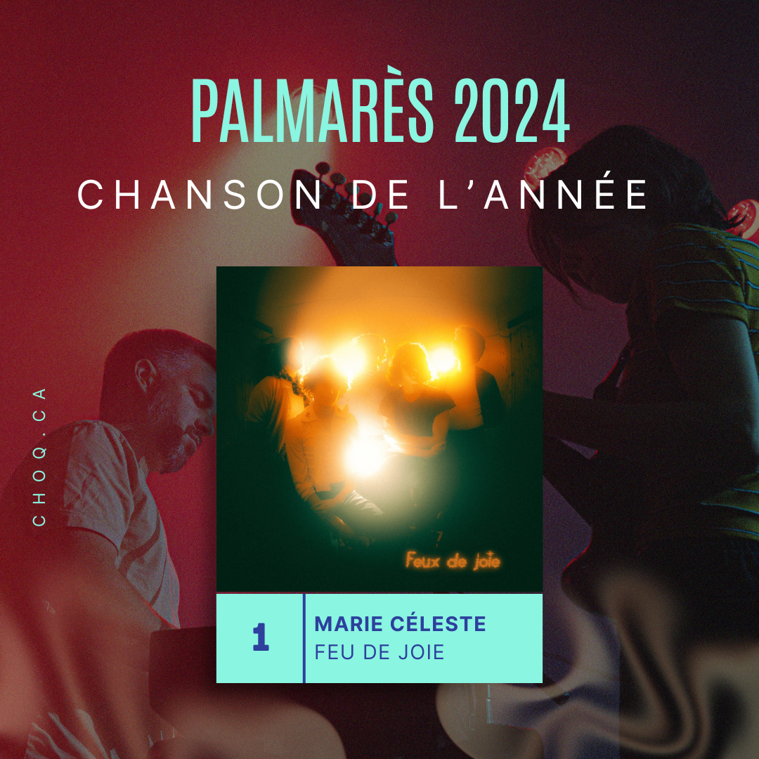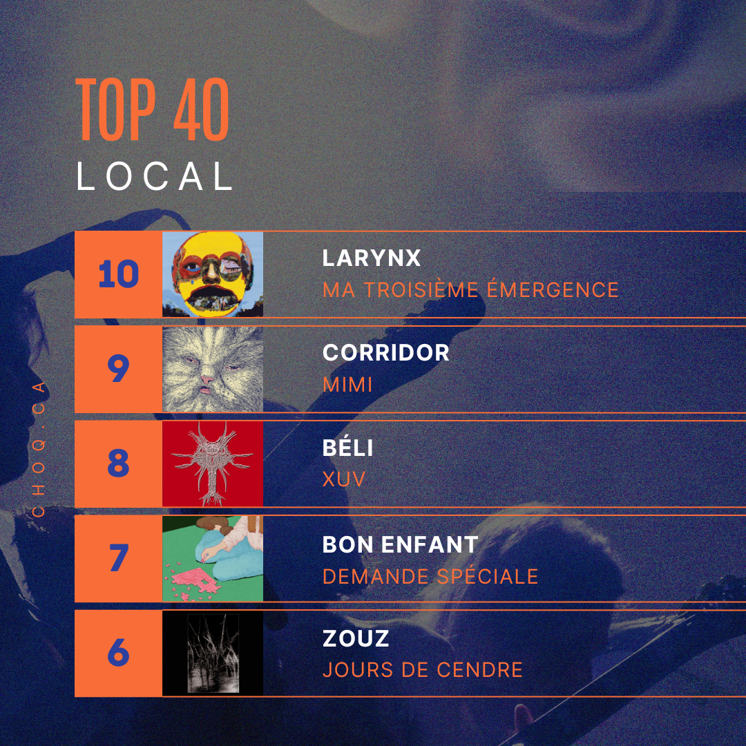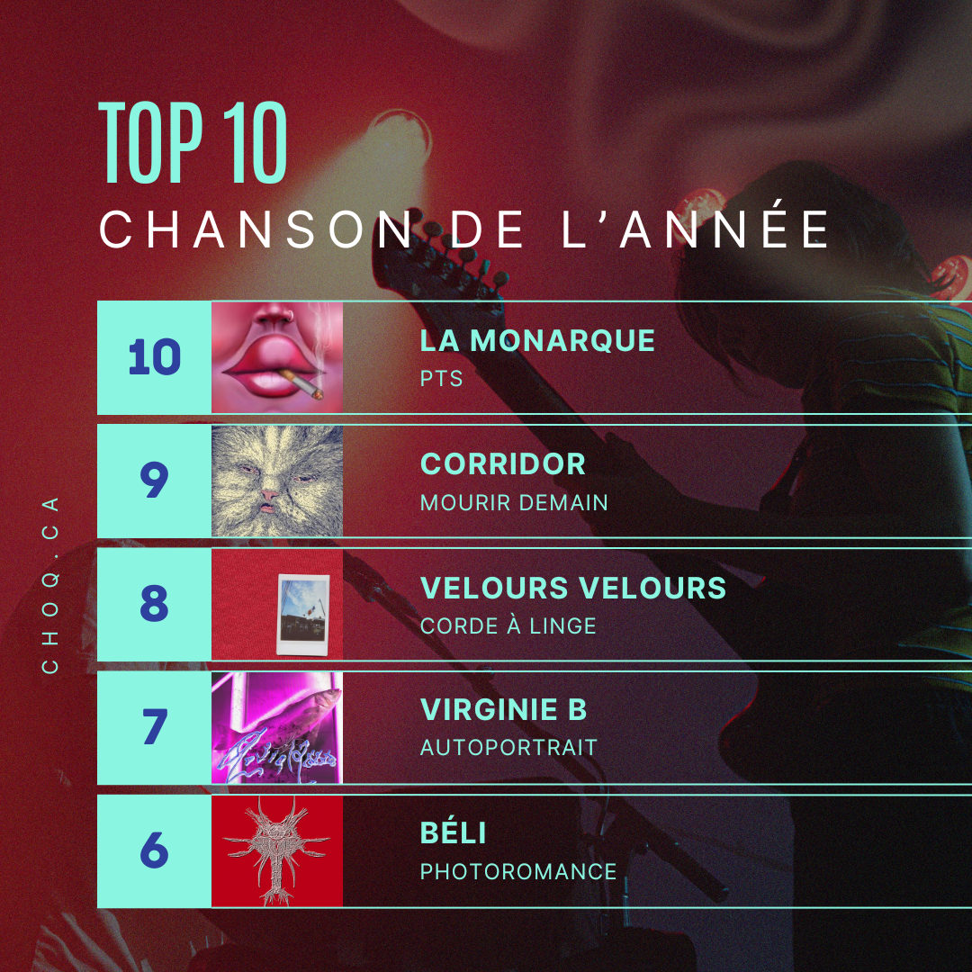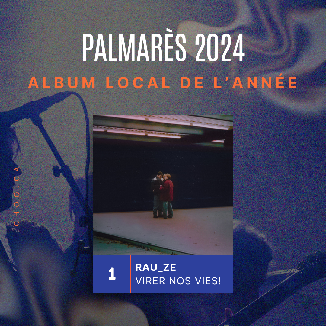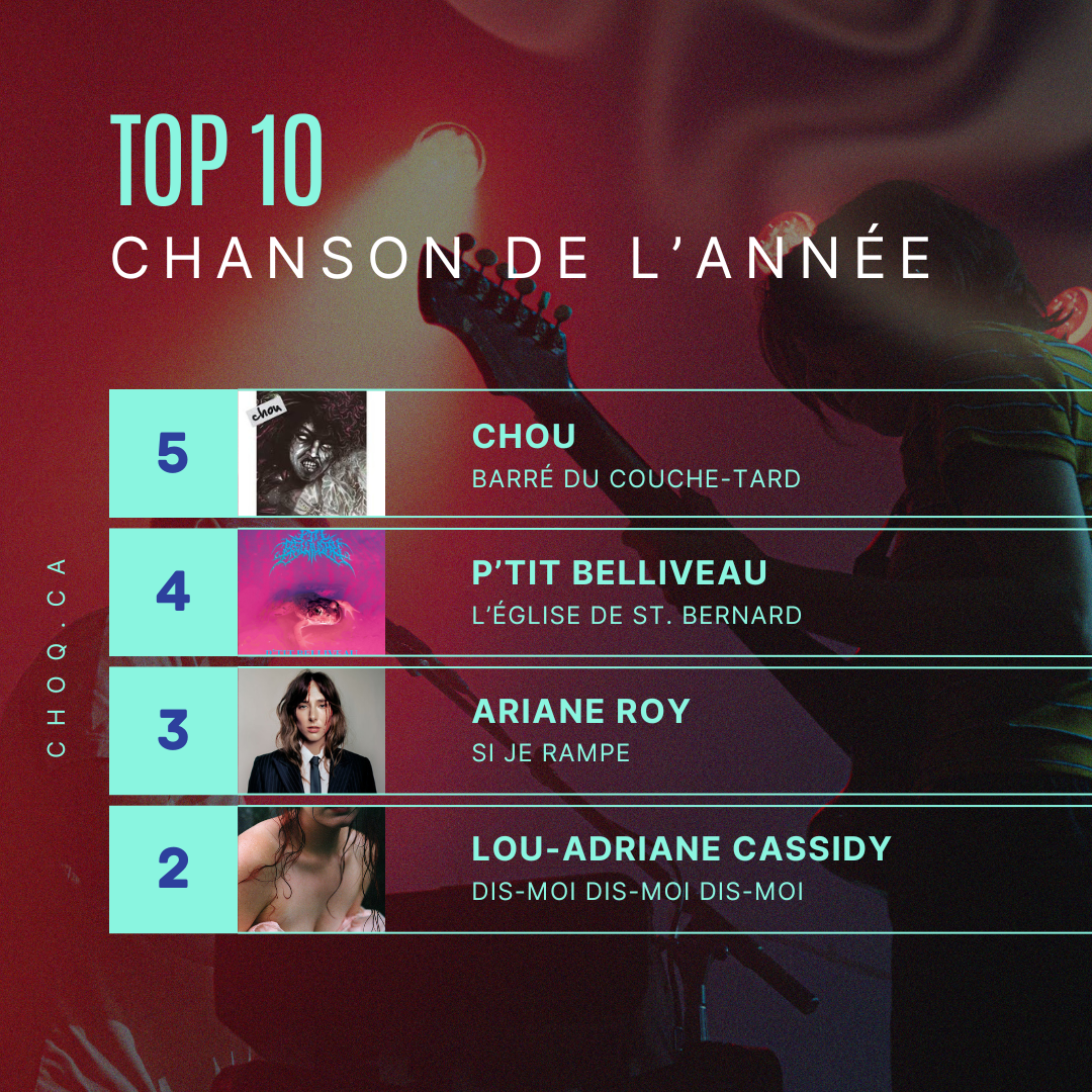 Voici donc, sans plus tarder, les résultats de nos palmarès de fin d'année. À noter que les visuels ont été créés par notre graphiste Alexandre Biguet à partir de photos prises par Luna Choquette Loranger lors de nos spectacles de la Grande Rentrée CHOQ en septembre dernier.
